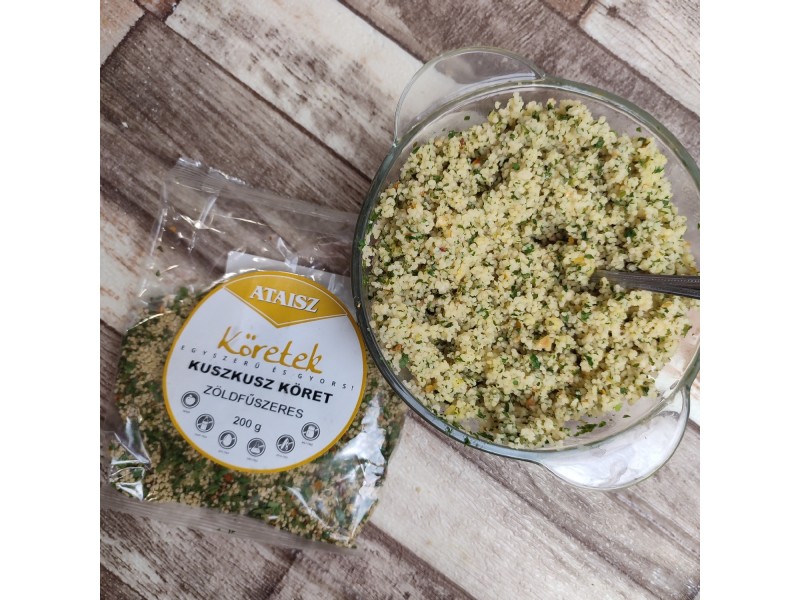 Kuszkusz (durumbúza), szárított zöldségek (sárgarépa, paszternák ), póré- és vöröshagyma, paradicsompehely.