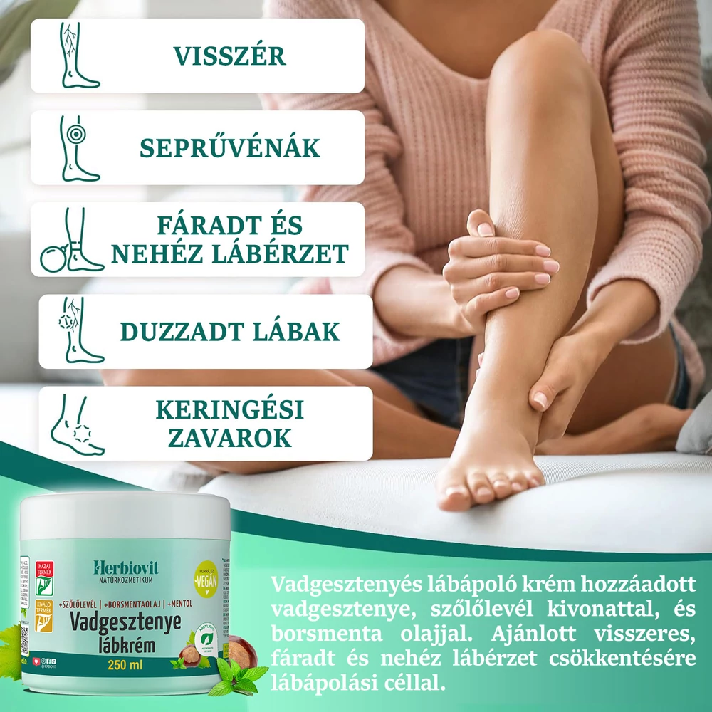 Vegán vadgesztenye lábkrém biztonsággal alkalmazható, ráadásul szőlőlevél, mentol, valamint borsmentaolajat is tartalmaz, ezért a visszeres panaszok mérséklése mellett táplálja a bőrt és kellemes, hűsítő érzést okoz. Használata rendkívül egyszerű: naponta kis mennyiséget kenj az érintett felületre és alaposan masszírozd a bőrödbe, amíg teljesen fel nem szívódik. A masszázs elősegíti a krémben levő hatóanyagok felszívódását.